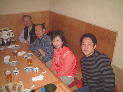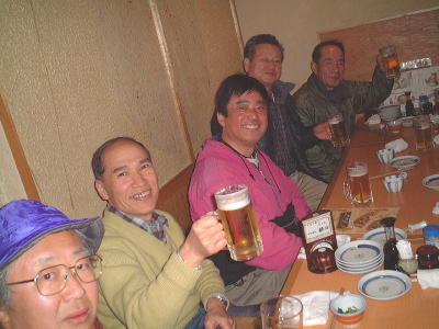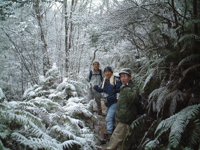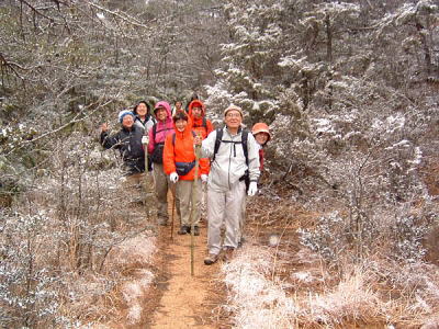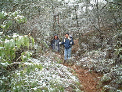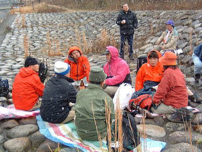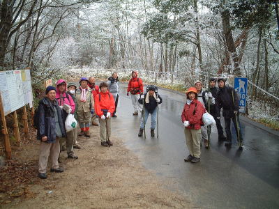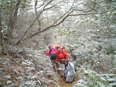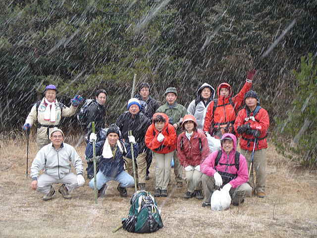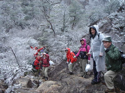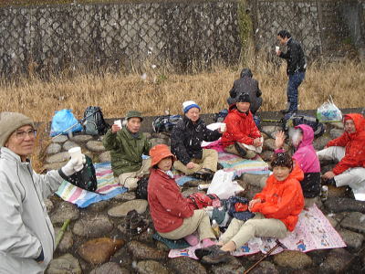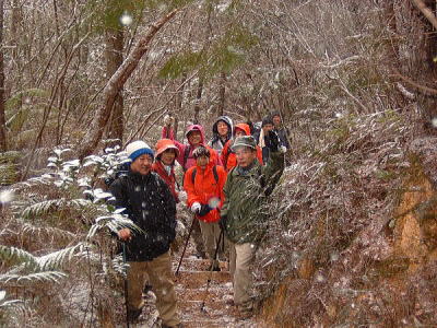 今年の山開きは大盛況で、かつてない14人もの大人数での開催となった。上関のバス停でバスを降りた頃は風もなく穏やかな春の太陽が輝いていた。新茂智神社の前の池は穏やかに春の新芽を膨らまそうとしている木々を写しだし、時折木の葉が落ちて水面に笑窪を作っている。数年前までは真冬に山開きをやっていたが、その当時は池の水が硬く凍り付き、通りがかった人が面白半分に投げた石が点々と池ノ上に転がっていた。さくさくと落ち葉を踏んで軽やかに談笑しながら林道を行き、そろそろ狭い登山道に近づいたかと思う頃、Nさんが林道脇の竹やぶで持参のノコギリを使って杖をつくりだした。ストックの無い人のために数本つくり、もらった人はその杖に今日一日お世話になる。登山道に入ると勾配がきつくなり、人数も多いだけ列が長くなる。汗もでてきて息づかいも荒くなる頃いつも休憩する展望のきく大きな岩の場所に着いた。前方の下に広がる大石の集落は来るたびに家が増えているようだ。その大石のすぐ横を流れる瀬田川が大きく蛇行するあたりに厄除けで有名な立木観音がある。瀬田川の右岸のすぐ側から700段の石段を上ったところにある古刹だが、ここからはわずかに屋根が見え、耳を澄ますと参拝客の突く鐘の音が、時々思い出したように瀬田川を渡り余韻を忘れて伝わってくる。10分程の休憩のあと山頂まではあと少しの頑張りである。突然登山道をぶち切るように、数年前に出来た林道を横切り、両手も使うほどの勾配の登山道をよじ登ると小さな木作りの鳥居がある。それをくぐり山肌をやがて左に這いつくばるように曲がり登っていくと、白山権現の祠が祭ってある。その祠の上が笹間ヶ岳の山頂(433m)である八畳岩だ。以前はこの山頂の八畳岩に上るには岩の出っ張りや割れた所に、手足をかけて上るロッククライミングが必要だったが、今は梯子や鎖が整備されて安全に上れるようになった。さすがに山歩会のメンバー十数人ともなると山頂は狭く、いつまでも居ると他の登山客に迷惑がかかりそうだ。山頂からの眺めは素晴らしく、北西には琵琶湖の向こうに山頂が雪で真っ白な比良山系が望まれ、東北には三上山や金勝アルプスの山並みが広がる。そこからは本日のメーンエヴェントである山開き会場の行われる大谷河原までは風化した花崗岩のやせ尾根を小さなアップダウンを何度か乗り越え下っていく。一頃このあたりは風化した花崗岩が露出し山全体が白く、大きな木が殆んど無く奇岩や巨岩の立ち並ぶ特異な風景が広がっていたが、これは古来多くの木を平城京の造営などの用材に伐採したために荒れた山になっていったという。近年その破壊された山の自然を取り戻すために植林が行われてきており、2.30年前にくらべてすっかり山も緑に覆われてきたが、その工事のために山頂近くにまで道路を作ってしまったのは何かがおかしいのではないだろうか。自然を取り戻すために自然を破壊する行為は絶対に許されるべき事ではないと思う。大谷河原は平坦な砂地で途中より山から流れてきた水が伏流水となり広場の端のほうに小さな池ができている。そこへは調度12時に着いた。着くとすぐに、その広場の端に持参のシートを広げて宴会場つくりである。今回の献立は鴨鍋。会員個々が寸法に気を使いながら持参した材料を手際よく吹田町鍋奉行が鍋に入れて仕上げていく。お酒も入り段々と盛り上がり、太陽が出て暖かかった広場もいつの間にか曇ってきて、雪がちらつきだす。久しぶりの山開きでの雪見酒となり、寒さも忘れてめったに見ることのない雪の降る山の風景とお酒に酔いしれる。Uさんの裕次郎節が出だした頃はすでに3時近くになった。帰り支度をして山を下りる頃は粉雪がボタン雪に変わり、瞬く間に周りが白銀の世界に早変りしたと思ううちに、やがてそれは幽玄の世界へと変化した。事のほか御仏河原の少し先の、岩肌を滑り落ちる水がつくる谷川のあたりの眺めはこの上なく素晴らしいもので、ただ、足早に通り過ぎていくのが勿体無いくらいだった。景色に見とれて転ばないように足元に注意しながら天神川まで下りてくる。ここからは天神川沿いの林道をたんたんとバス停まで下る。今年は皆さんの足取りはしっかりして、誤ってせっかくの収穫物をゴミとして捨てられたなどの過去の経験を心配せずに帰れそうだ。バス停に着いて時間を見ると50分の待ち時間がある。そこで飲み残したアルコールがあるので二次会をしょうと言う事になり、バス停の横の天神川の土手で雪のちらつく中での宴会が始まった。時間はあっという間にすぎてバスに乗り込み石山駅へ向かう。雪もやみ薄っすらと色づいた夕暮れの雲がゆっくりと流れている。石山でJRに乗りこみこのまま家に帰るのも何だ?と有志で京都駅で降りて近くの居酒屋で三次会を開く。ここでも楽しく雑談などでひと時を過ごし、日ごろのストレスもすっかり回復したようで、明日から頑張るぞと店をで