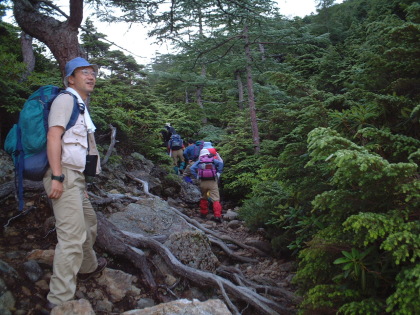 登山口から続くシラビソの樹林帯を行く |