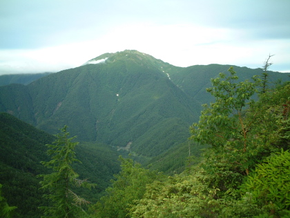 仙水峠より駒津峰までは急登が続く。樹林帯をぬけハイマツ帯に変わるころからの仙丈ケ岳 |