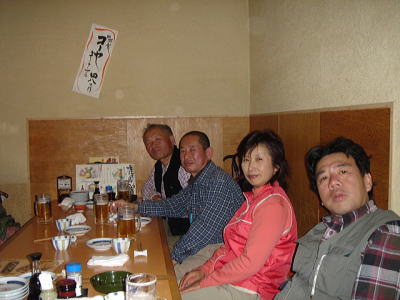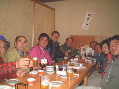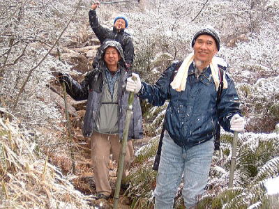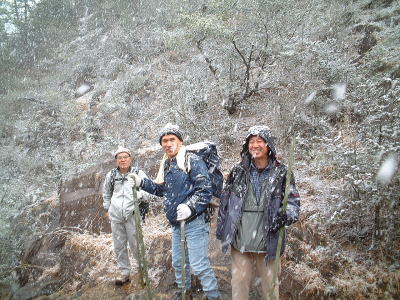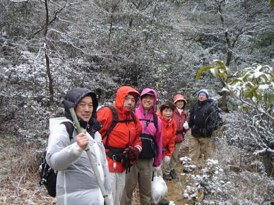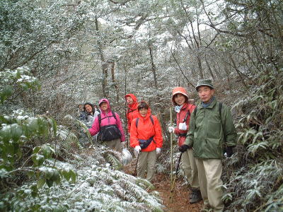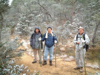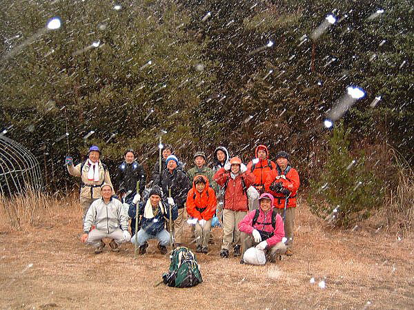 今年の山開きは大盛況で、かつてない14人もの大人数での開催となった。上関のバス停でバスを降りた頃は風もなく穏やかな春の太陽が輝いていた。新茂智神社の前の池は穏やかに春の新芽を膨らまそうとしている木々を写しだし、時折木の葉が落ちて水面に笑窪を作っている。数年前までは真冬に山開きをやっていたが、その当時は池の水が硬く凍り付き、通りがかった人が面白半分に投げた石が点々と池ノ上に転がっていた。さくさくと落ち葉を踏んで軽やかに談笑しながら林道を行き、そろそろ狭い登山道に近づいたかと思う頃、Nさんが林道脇の竹やぶで持参のノコギリを使って杖をつくりだした。ストックの無い人のために数本つくり、もらった人はその杖に今日一日お世話になる。登山道に入ると勾配がきつくなり、人数も多いだけ列が長くなる。汗もでてきて息づかいも荒くなる頃いつも休憩する展望のきく大きな岩の場所に着いた。前方の下に広がる大石の集落は来るたびに家が増えているようだ。その大石のすぐ横を流れる瀬田川が大きく蛇行するあたりに厄除けで有名な立木観音がある。瀬田川の右岸のすぐ側から700段の石段を上ったところにある古刹だが、ここからはわずかに屋根が見え、耳を澄ますと参拝客の突く鐘の音が、時々思い出したように瀬田川を渡り余韻を忘れて伝わってくる。10分程の休憩のあと山頂まではあと少しの頑張りである。突然登山道をぶち切るように、数年前に出来た林道を横切り、両手も使うほどの勾配の登山道をよじ登ると小さな木作りの鳥居がある。それをくぐり山肌をやがて左に這いつくばるように曲がり登っていくと、白山権現の祠が祭ってある。その祠の上が笹間ヶ岳の山頂(433m)である八畳岩だ。以前はこの山頂の八畳岩に上るには岩の出っ張りや割れた所に、手足をかけて上るロッククライミングが必要だったが、今は梯子や鎖が整備されて安全に上れるようになった。さすがに山歩会のメンバー十数人ともなると山頂は狭く、いつまでも居ると他の登山客に迷惑がかかりそうだ。山頂からの眺めは素晴らしく、北西には琵琶湖の向こうに山頂が雪で真っ白な比良山系が望まれ、東北には三上山や金勝アルプスの山並みが広がる。そこからは本日のメーンエヴェントである山開き会場の行われる大谷河原までは風化した花崗岩のやせ尾根を小さなアップダウンを何度か乗り越え下っていく。一頃このあたりは風化した花崗岩が露出し山全体が白く、大きな木が殆んど無く奇岩や巨岩の立ち並ぶ特異な風景が広がっていたが、これは古来多くの木を平城京の造営などの用材に伐採したために荒れた山になっていったという。近年その破壊された山の自然を取り戻すために植林が行われてきており、2.30年前にくらべてすっかり山も緑に覆われてきたが、その工事のために山頂近くにまで道路を作ってしまったのは何かがおかしいのではないだろうか。自然を取り戻すために自然を破壊する行為は絶対に許されるべき事ではないと思う。大谷河原は平坦な砂地で途中より山から流れてきた水が伏流水となり広場の端のほうに小さな池ができている。そこへは調度12時に着いた。着くとすぐに、その広場の端に持参のシートを広げて宴会場つくりである。今回の献立は鴨鍋。会員個々が寸法に気を使いながら持参した材料を手際よく吹田町鍋奉行が鍋に入れて仕上げていく。お酒も入り段々と盛り上がり、太陽が出て暖かかった広場もいつの間にか曇ってきて、雪がちらつきだす。久しぶりの山開きでの雪見酒となり、寒さも忘れてめったに見ることのない雪の降る山の風景とお酒に酔いしれる。Uさんの裕次郎節が出だした頃はすでに3時近くになった。帰り支度をして山を下りる頃は粉雪がボタン雪に変わり、瞬く間に周りが白銀の世界に早変りしたと思ううちに、やがてそれは幽玄の世界へと変化した。事のほか御仏河原の少し先の、岩肌を滑り落ちる水がつくる谷川のあたりの眺めはこの上なく素晴らしいもので、ただ、足早に通り過ぎていくのが勿体無いくらいだった。景色に見とれて転ばないように足元に注意しながら天神川まで下りてくる。ここからは天神川沿いの林道をたんたんとバス停まで下る。今年は皆さんの足取りはしっかりして、誤ってせっかくの収穫物をゴミとして捨てられたなどの過去の経験を心配せずに帰れそうだ。バス停に着いて時間を見ると50分の待ち時間がある。そこで飲み残したアルコールがあるので二次会をしょうと言う事になり、バス停の横の天神川の土手で雪のちらつく中での宴会が始まった。時間はあっという間にすぎてバスに乗り込み石山駅へ向かう。雪もやみ薄っすらと色づいた夕暮れの雲がゆっくりと流れている。石山でJRに乗りこみこのまま家に帰るのも何だ?と有志で京都駅で降りて近くの居酒屋で三次会を開く。ここでも楽しく雑談などでひと時を過ごし、日ごろのストレスもすっかり回復したようで、明日から頑張るぞと店をで