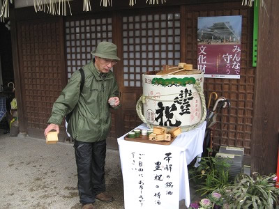 いつもの帯解寺では、お参りしたあとおいしい樽酒のご相伴