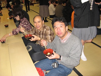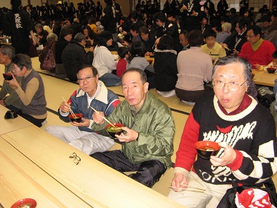 なんともいえない絶妙な芳香がただよい、お箸で数秒間お餅を御つゆに沈め次に口へ運び一口そっとかむと、サクットした歯ごたえと鼻をスーとくすぐりながら抜けていくその香ばしい香り、なんともいえない至福の時間の始まりです。 歩いてきた事もあり家では食べた事のないほどのお雑煮がお腹に入る。10個くらいも食べたと言う隊員もおりました。 |